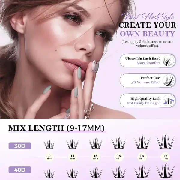 At-home beauty product designed to create professional-looking eyelash extensions without a salon visit. The kit includes120-320 Eyelash Clusters: Mixed lengths (often ranging from 8mm to 17mm) to allow for customization of styles like natural, round, or cat-eye. Also includes a dual-sided adhesive and sealant to secure the lashes and extend their wear time. A specialized applicator tool for precise cluster placement. Also, includes a specially formulated solution for safe, gentle removal that minimizes damage to natural lashes.