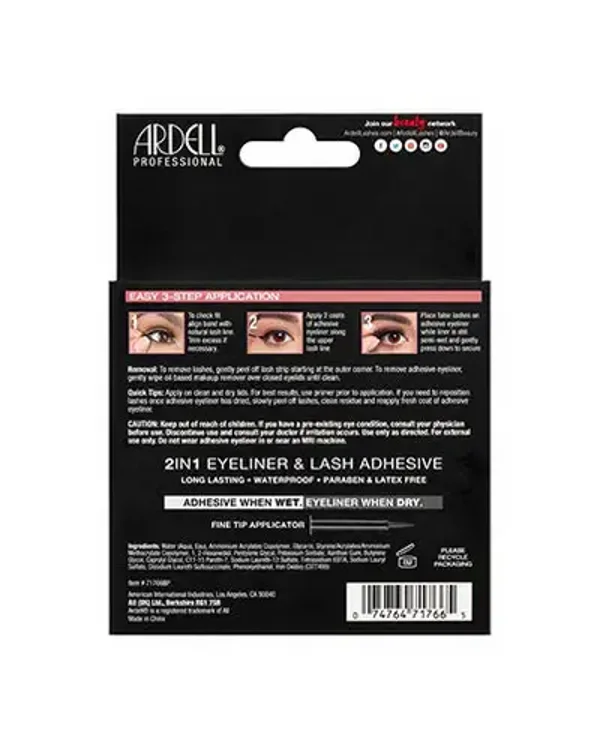 Ardell Lash Contour 370 are designed to create a "center volume" effect for a dramatic, eye-opening look. This kit features two pairs of medium-volume, long-length lashes with concentrated density in the center to mimic a "doe-eyed" appearance. The kit includes a 2-in-1 adhesive eyeliner in black. This waterproof formula acts as both a pigmented eyeliner and a lash adhesive, simplifying the application process. These lashes are lightweight and feature soft lash fibers for a comfortable wear.